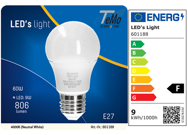 1 STÜCK (VPE) SHADA LED Classic E27, 806lm, 8,5 Watt, neutralweiss 4000K, A60 Opal, EEC: F (0601188)