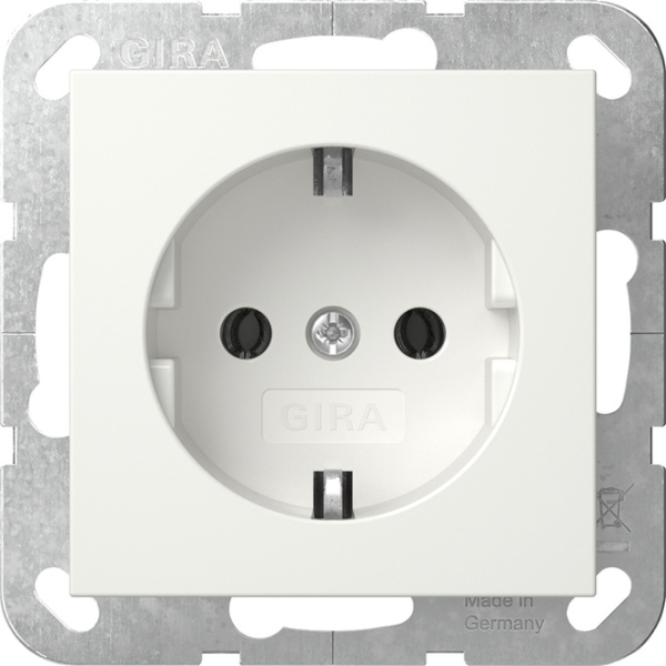 SCHUKO-Steckdose 16 A 250 V~ ohne Befestigungskrallen Reinweiß glänzend System 55 Mit erhöhtem Anpressdruck des Erdungsbügels geprüft nach T.N.O.
